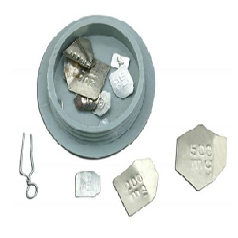 Série de 12 plaquettes aluminium marquées comme suit, livrées dans une boîte en plastique : 1x5dg, 2x2dg, 1x1dg, 1x5cg, 2x2cg, 1x1cg, 1x5mg, 2x2mg, 1x1mg