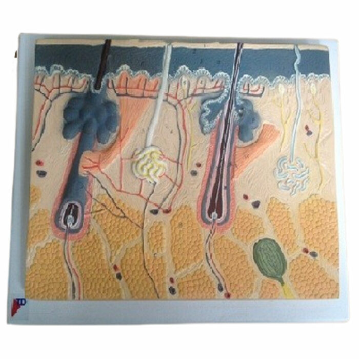 Le modèle représentent des sections de la peau humaine avec un grossissement de 80x. Les différences anatomiques des sections de peau sont représentées didactiquement de manière compréhensible.
