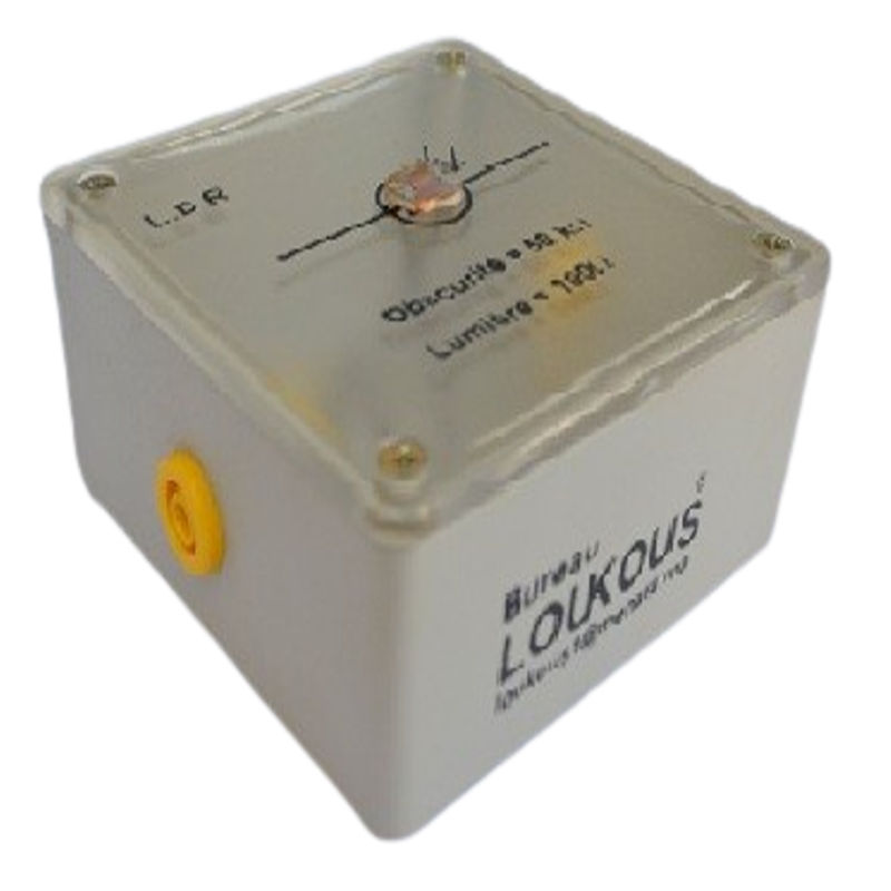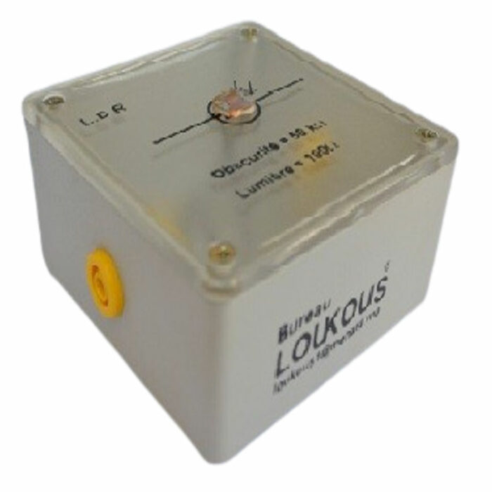 LDR (light dépendant résistor) résistance dépendant de l’éclairage dans le domaine visible,les connexions électriques sont réalisées par l’intermédiaire de douilles double puits. Une sérigraphie représente le schéma normalisé du composant.